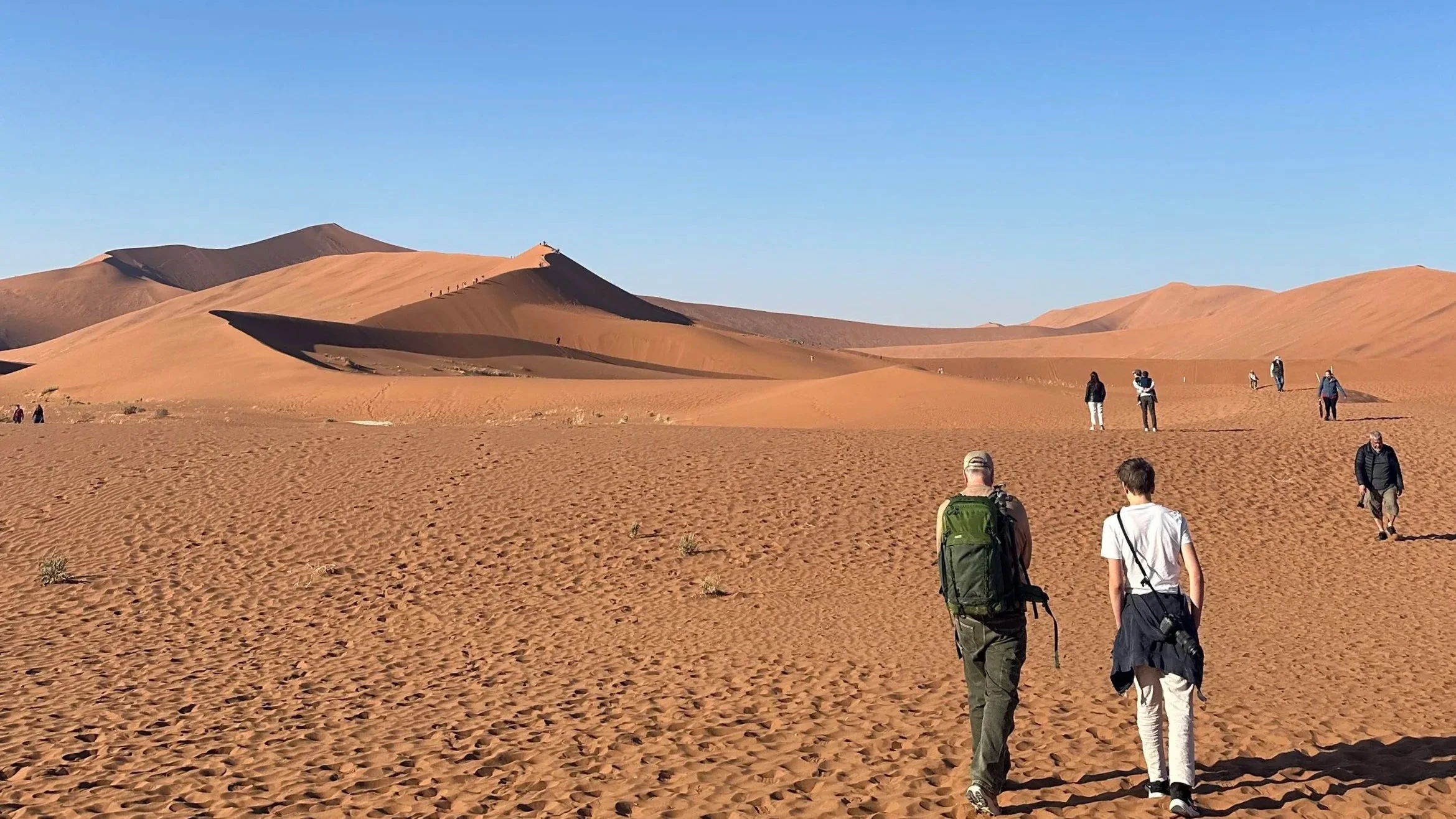 From the drop-off point, we walked about 1.5 kilometers through soft sand between towering dunes.